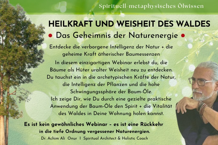 Der Wald ist nicht nur ein Ökosystem, sondern ein evolutionäres Bewusstseinsfeld, eine lebendige Bibliothek der Naturenergie. Jeder Baum trägt Jahrmillionen an Erfahrung, Intelligenz und heiliger Struktur in sich. Dr. Ali Achim Onur zeigt Dir die Geheimnisse und die verborgene Mystik des Waldes sowie konkrete Wege, wie du ihre Ausstrahlung spüren, ihre Botschaften empfangen und ihre heilenden Kräfte für Körper, Geist und Seele nutzen kannst.